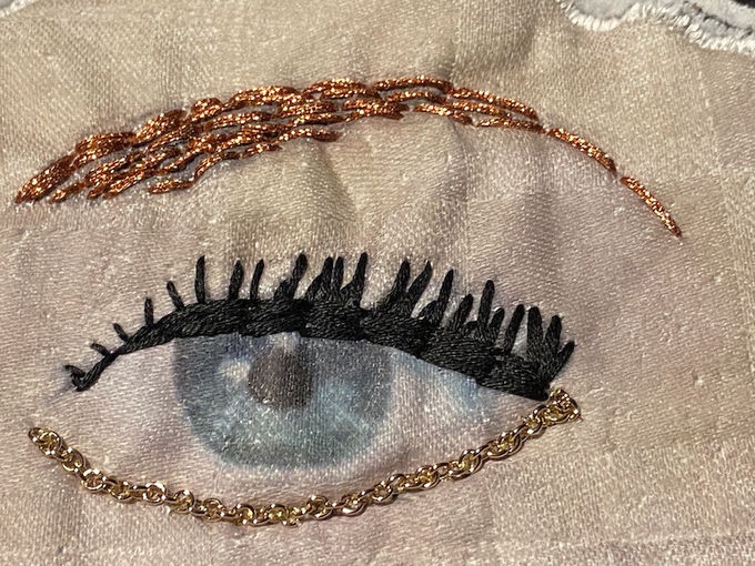 Polaire rebrodé de sequins, transferts sur tissus rebrodés, faux cuir brodé.