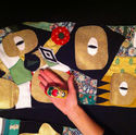 Polaire double face, chutes de tissus imprimés, broderie mains, appliqués de coton et faux cuir.
